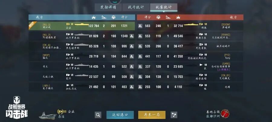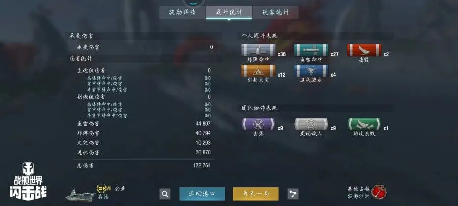 舰长@胡必成驾驶M系VIII级航空母舰企业炸弹命中36发!鱼雷命中27发!引起火灾12次!击毁敌方战舰2艘!造成进水4次!总伤害12w+!恭喜舰长获得水火无情史诗勋章!