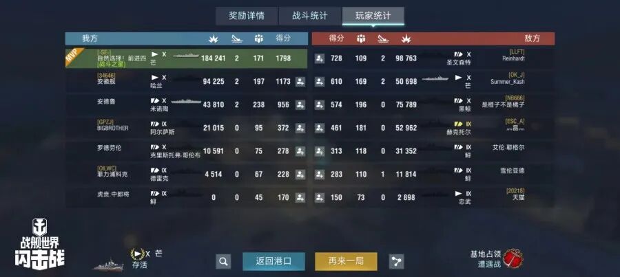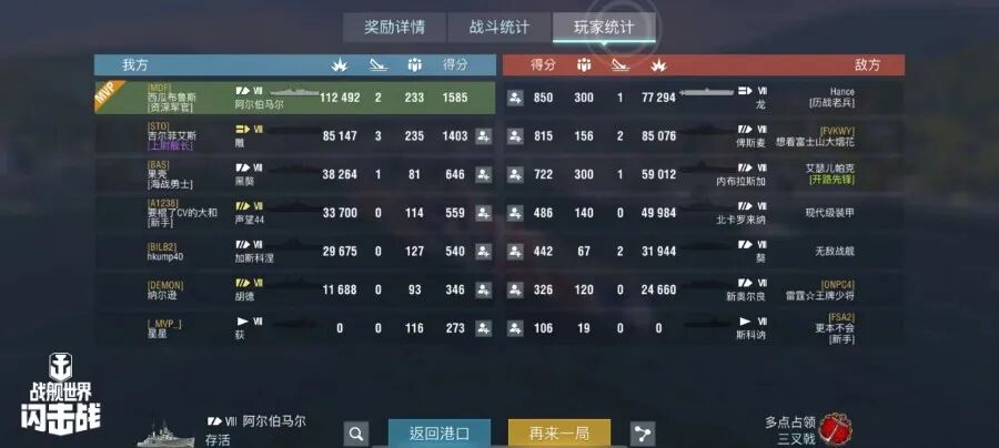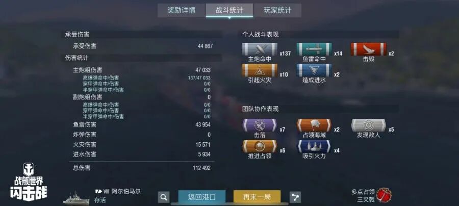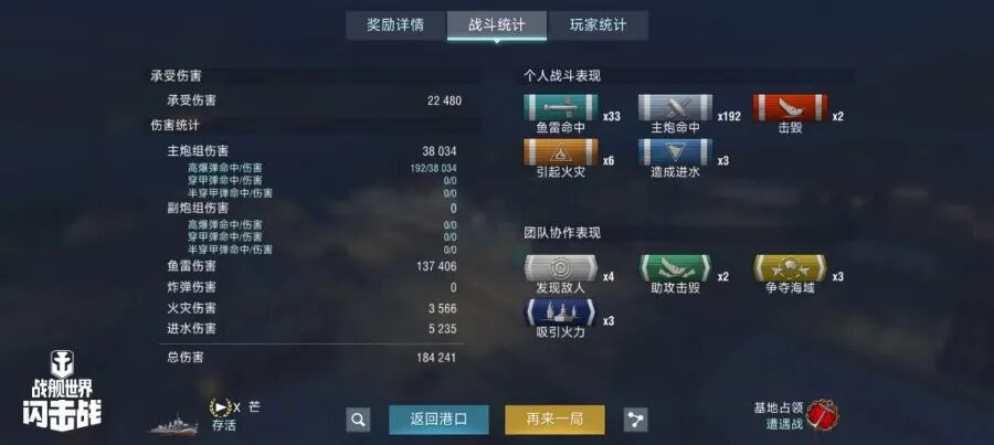舰长@自然选择!前进四驾驶R系X级驱逐舰芒鱼雷命中33发!主炮命中192发!击毁敌方战舰2艘,造成敌舰起火6次!总伤害18w+!恭喜舰长获得战斗胜利~