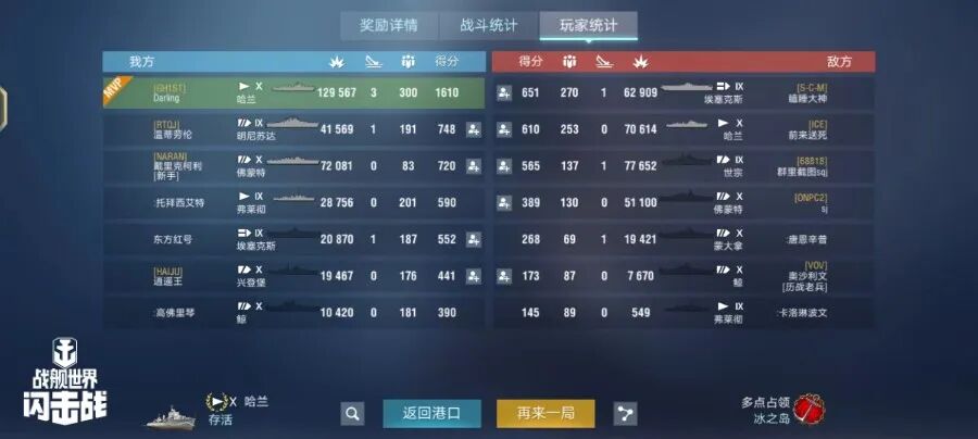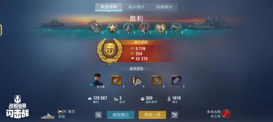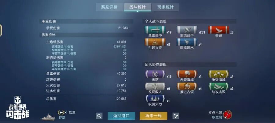 舰长@Darling驾驶O系X级驱逐舰哈兰鱼雷命中19发!主炮命中233发!击毁敌方战舰3艘,造成敌舰起火8次!总伤害达12w+!恭喜舰长获得水火无情史诗勋章~