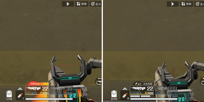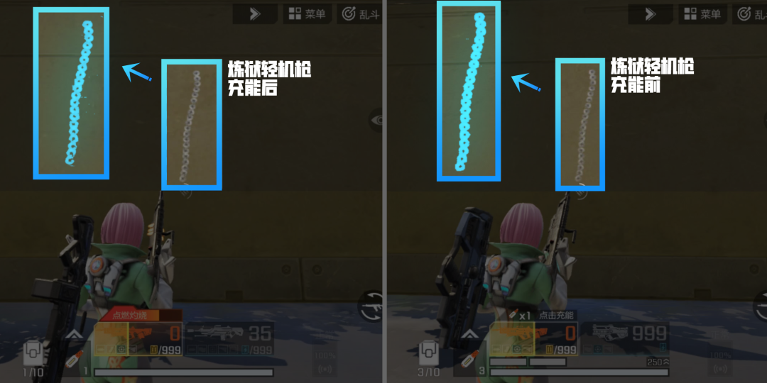 炼狱轻机枪充能后(左)与充能前(右)弹道对比