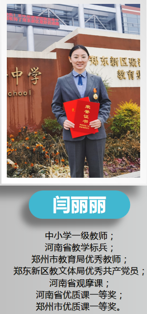 郑州十一中教育集团郑东校区(86中)副校长。中小学高级教师。河南省骨干教师、郑州市优秀班主任、郑州市先进教育工作者、郑州市文明教师、河南省优质课一等奖、郑州市教育系统教学技能竞赛一等奖、郑州市优质课一等奖。主持或参与多项省、市级课题并获省级优秀二、三等奖,市级课题成果一等奖、国家级论文特等奖。