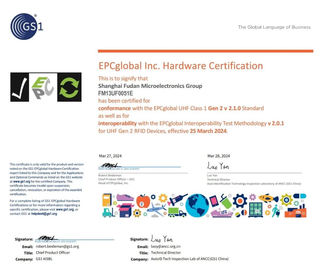 近日,上海复旦微电子集团股份有限公司UHF RFID(超高频)标签芯片FM13UF0051E经第三方权威机构(中国物品编码中心)检测,成功通过GS1 EPC global Gen2V2认证。该机构是亚太地区唯一一家获得国际物品编码组织(GS1)授权的认证测试机构;标志着公司产品可在全球范围内实现统一标识和透明追溯。(复旦微电子集团)