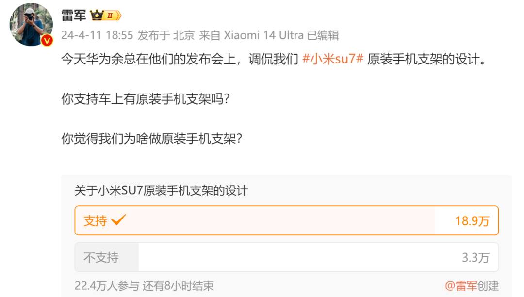 随后,雷军发文称,“今天华为余总在他们的发布会上,调侃我们小米SU7原装手机支架的设计。”同时,他发起投票,“你支持车上有原装手机支架吗?你觉得我们为啥做原装手机支架?”