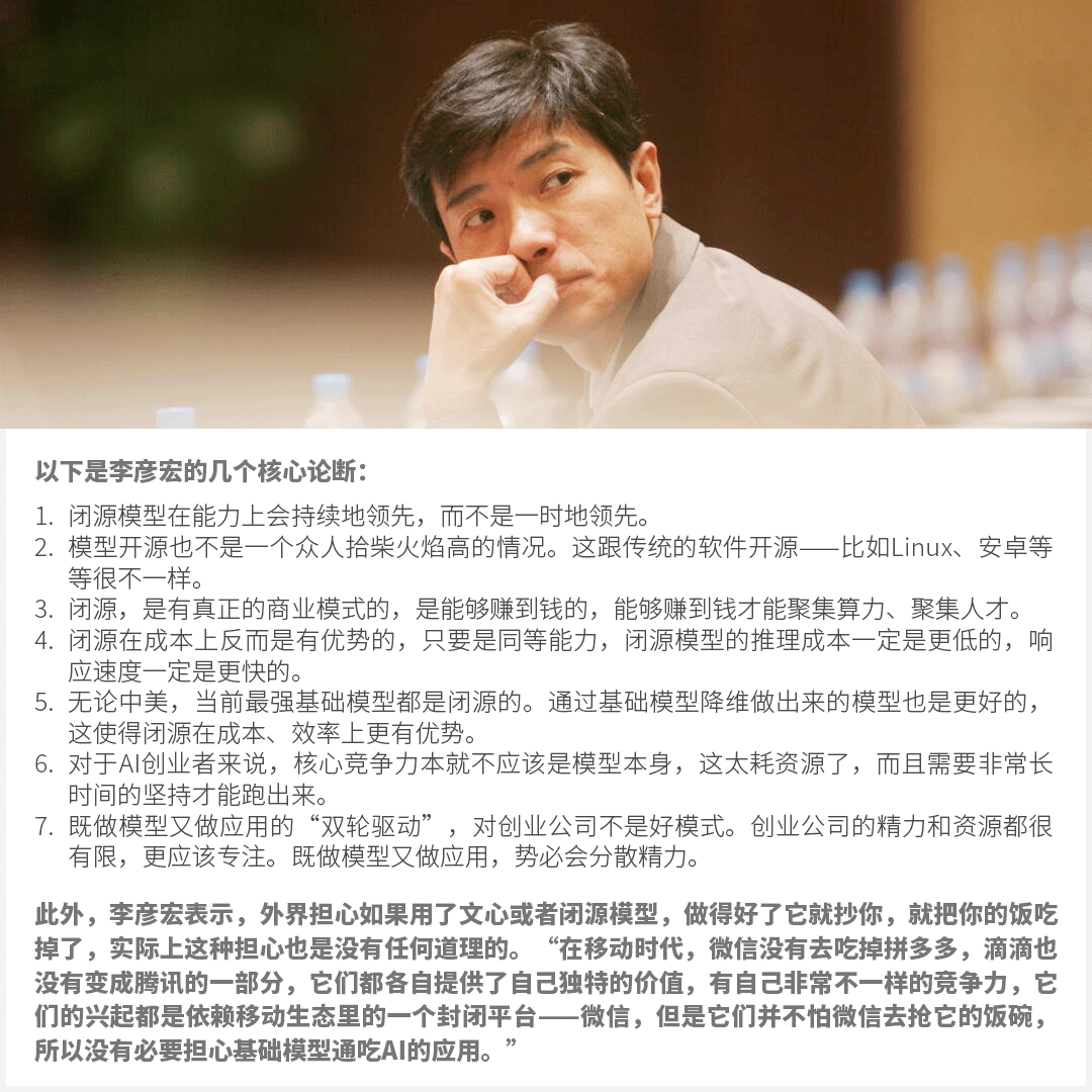 4月11日,一则李彦宏内部讲话流出。在内部讲话中,李彦宏对大模型开源与闭源的路线选择以及AI创业者应该专注模型还是应用等业界焦点话题,发表了自己的看法。以下是李彦宏的几个核心论断:(新浪科技)