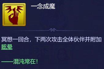 一念成魔:冥想一回合,下两次攻击全体伙伴并附加眩晕