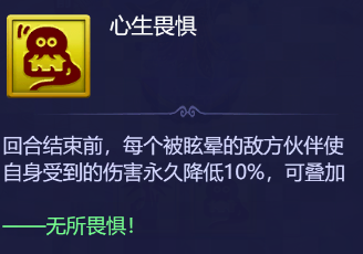 心生畏惧:回合结束前,每个被眩晕的敌方伙伴使自身受到的伤害永久降低10%,可叠加