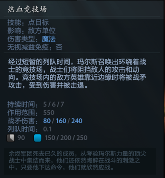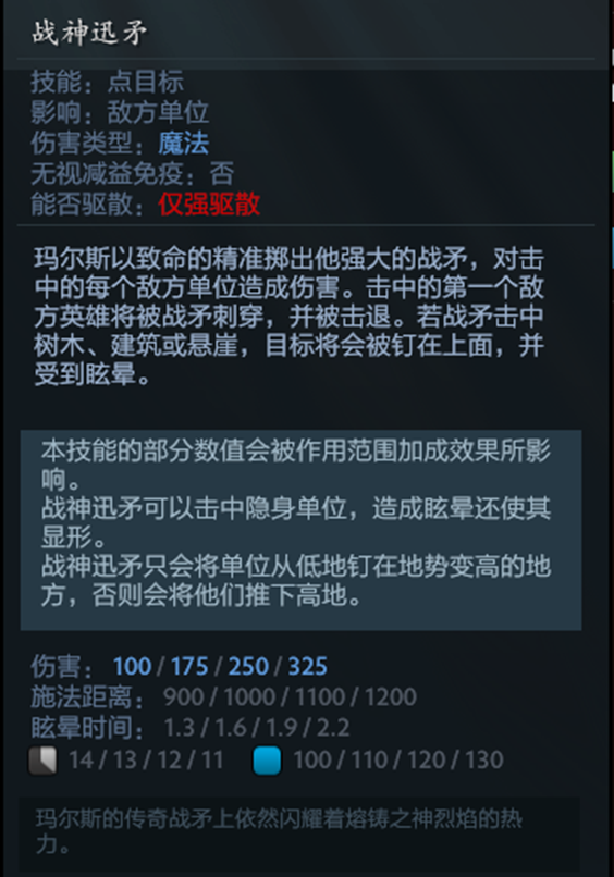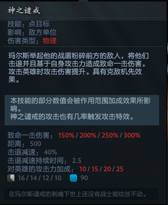 玛尔斯对前方所有单位施加致命一击伤害,并且将他们击退,之后使其减速。该技能可以继承攻击特效,一般可以和黯灭的减甲形成配合。前期一般用他来补刀耗血,也可以把近战英雄击退让他漏刀。这个技能释放时候也要注意,也会让敌人跨越地形。