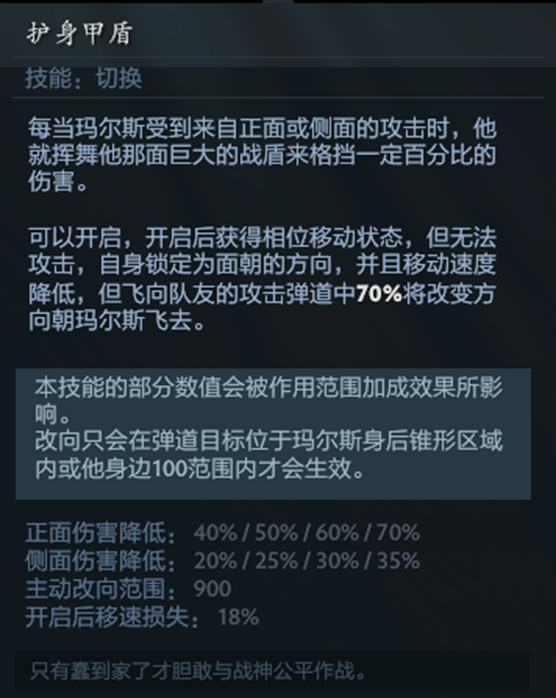 让玛尔斯在正对敌人的时候,减少受到的攻击伤害。开启后可以将敌方的远程攻击弹道吸引到自己身上。这个技能被削弱过,目前吸引弹道的能力大幅度下降。一般不需要主动释放。对线远程英雄可以举一举盾干扰对方补刀。
