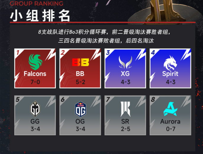 来到小组赛第二阶段,Falcons火力全开,7个Bo3全胜,其中六场比赛都为2-0取胜,毫无悬念晋级淘汰赛胜者组。