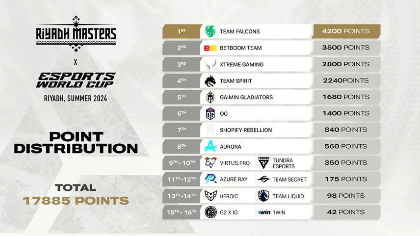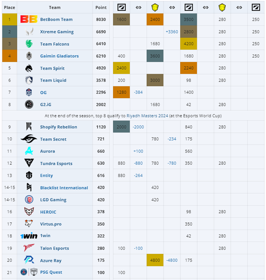 目前在EPT积分榜上,BB战队以8030分雄踞第一,他们已经确定获得利雅得大师赛的直邀;XG、Falcons与GG依次为2~4名,直邀资格也是十拿九稳。