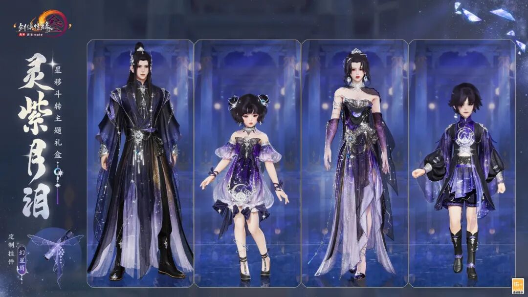 星移斗转主题礼盒“灵紫月泪”以黑紫双色为主色调,鎏银材质的星纹点缀其间,幻作星光垂落九天,在新衣服上数星星咯