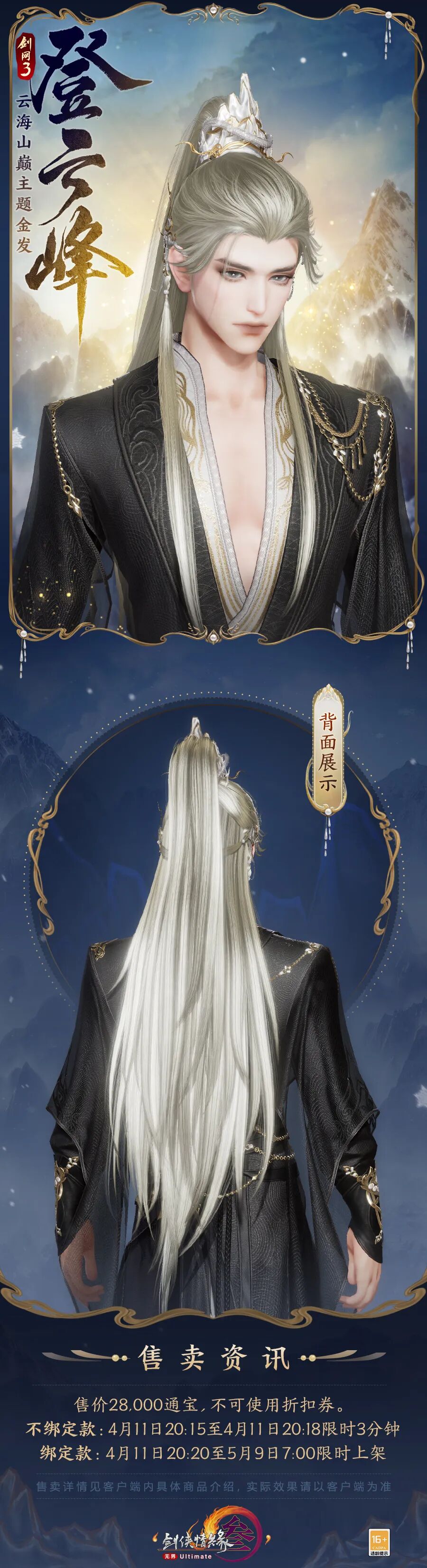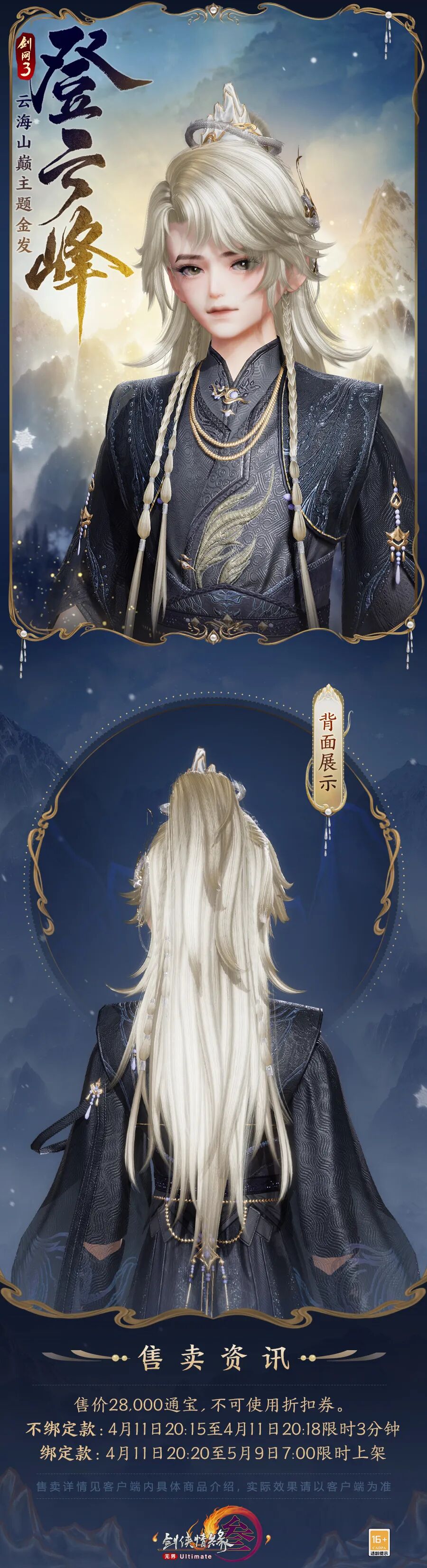 男款头顶以山川云海拟形发冠装饰,精致金饰缀于耳侧,与暗金色底相映衬,古雅不凡,肩上小束几绺辫发,英姿飒爽而不乏灵动之气。