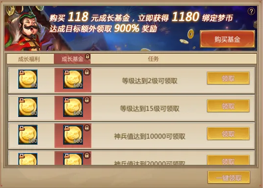 第三期成长基金同样可以通过完成任务获得绑定梦三币*1180,购买后,仙术师可以立刻获得1180绑定梦币,完成任务额外得至少900%绑币奖励!