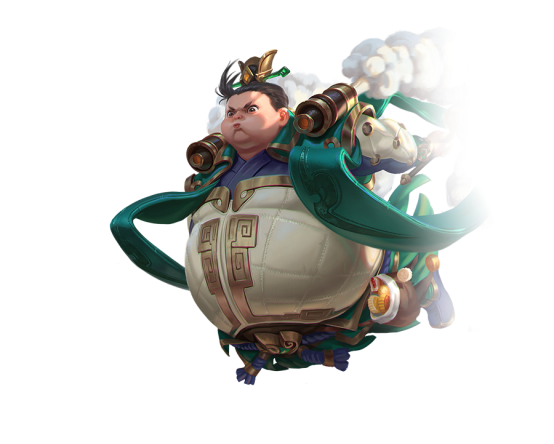 充气服膨胀变大,移动时会如车轮般滚动,移动速度提升至极限,持续6秒碰撞到敌方英雄或使用物品、技能时会停止滚动,造成范围伤害和眩晕。
