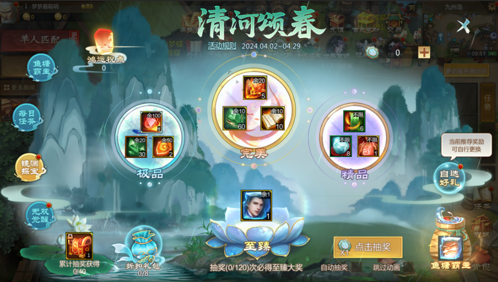 使用一个清河镜可进行镜渊探宝,活动期间仙术师可自选至臻、完美、极品和精品物品加入奖池,累计抽奖达120抽必得至臻奖励,获得至臻奖励后将重置该累计次数。每层自选奖励未抽到前均可前往自选好礼更换。