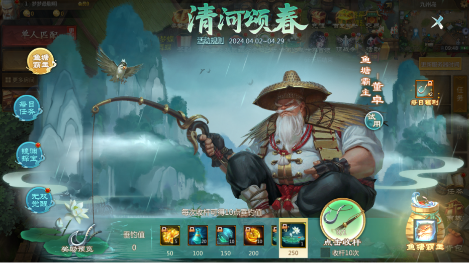 使用鱼钩收杆钓鱼,可获得垂钓值,累计垂钓值可获得丰厚的垂钓奖励。