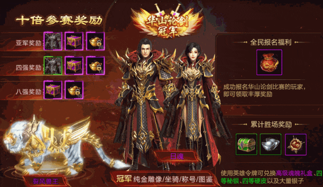 华山论剑冠军更可获得专属荣耀称号,限定坐骑“裂风兽王”以及黑金配色的日魂时装!冠军战队更可尊享定制纯金雕像!