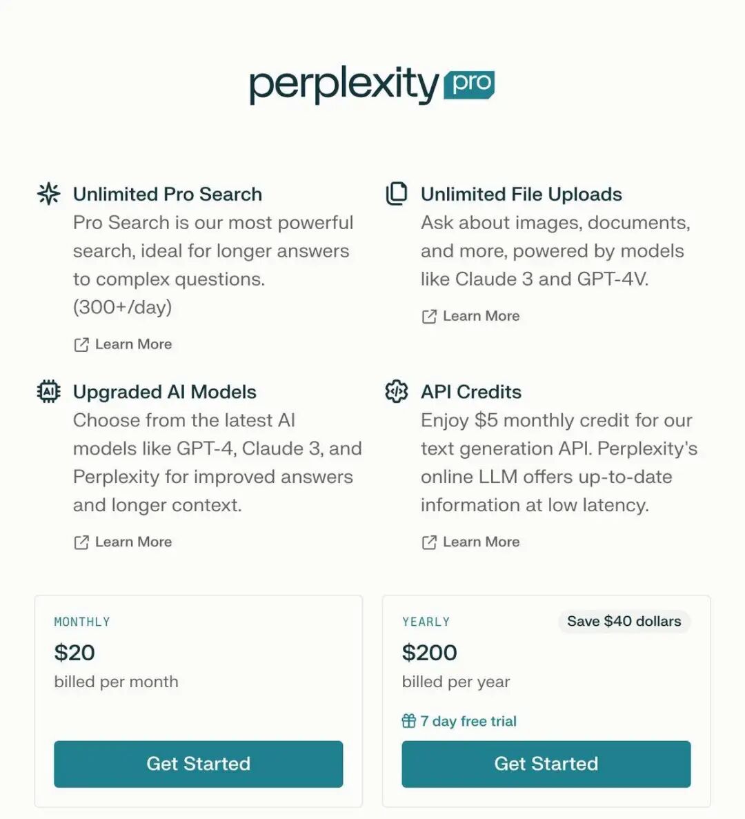 得到答案那一刻,「Library」功能还允许用户将问题和答案以线程形式存档,支持公开或私密的协作。这不仅便于用户回顾和梳理知识体系,也鼓励了知识的共享与合作。类似于新闻聚合器的功能,「Discover」则提供了一个探索热点话题的平台,相当于微博热搜的精华版,满足了用户对新鲜信息的需求。现在,这项功能在 APP 页面上也迎来了新的变化。从形式上看,Perplexity 似乎有意打造一个文字版的 Tiktok。以上这些功能共同构建了一个以用户为核心的交互环境,提升了信息检索效率,促进了知识的累积与传播,让用户在单一平台上体验从提问到知识构建的完整流程。值得注意的是,Perplexity 的基础版本对所有用户免费使用。用户也可以启用有一定限制的 Copilot 搜索功能。但在「钞能力」的加持下, Copilot 搜索功能将会解锁更多高级特性。这一功能由 GPT-4 等先进 AI 模型提供支持,每月需要 20 美元的订阅花费,若用户对答案不满意,还可以切换到不同的 AI 模型,如 Perplexity LLM、GPT-4 Turbo 和 Claude 3,以及前段时间大火的 Mistral-Large 新模型。几乎每当有新的 AI 热门模型问世,Perplexity 总能在第一时间将其整合到平台中,这也是广受用户好评的一点。基础版足以满足大部分用户的日常使用,但对于频繁使用搜索和处理信息的用户而言,升级到付费版可能是一个更明智的选择。我没有想过要打造一个搜索引擎,这一概念甚至没有进入我脑海。