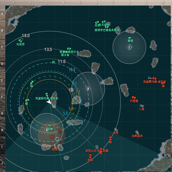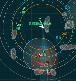在上方小地图中,我们通过和队友潜艇的配合,可以看到被标记出来的敌方潜艇的精确航向,而敌方潜艇在这个过程中不会收到任何警告,一般只会按照原定计划进行机动,以上图的白鱼为例,他就是想要尝试占领这个点位。