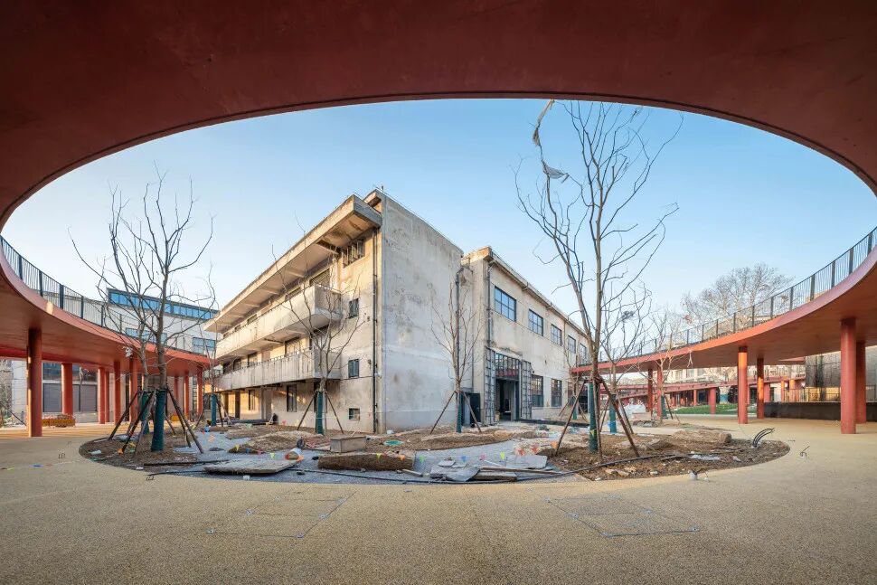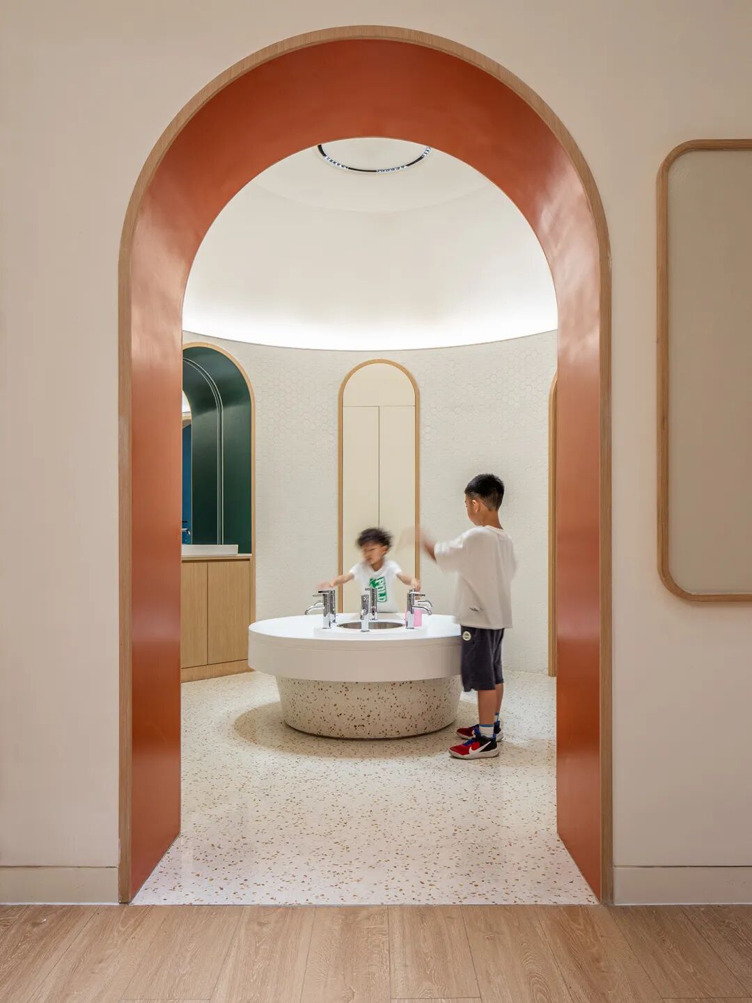 Kokaistudios从家具到装置、从标识设计到储物空间,一切设计元素都以儿童为中心的原则,为用户创造了自然的好奇心和互动之旅。设计为避免线性动线和过于单一的层次,安置了多种体量和有趣的探索点位;原本单一的走廊被流动的内部社交空间和相互连接的室内操场所取代;圆形元素的标识则体现出公共区域的连续性。