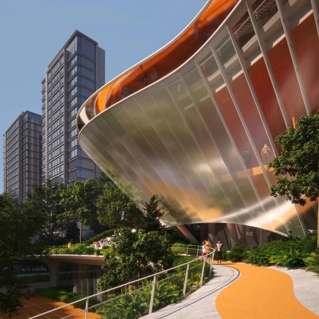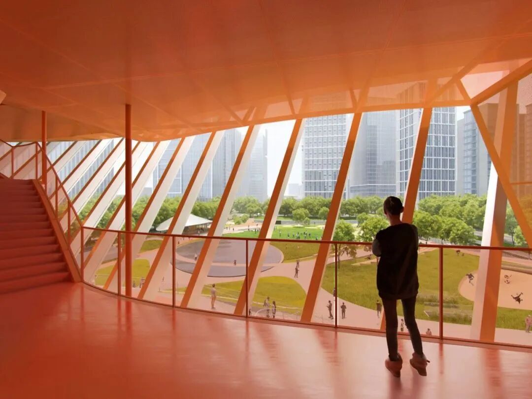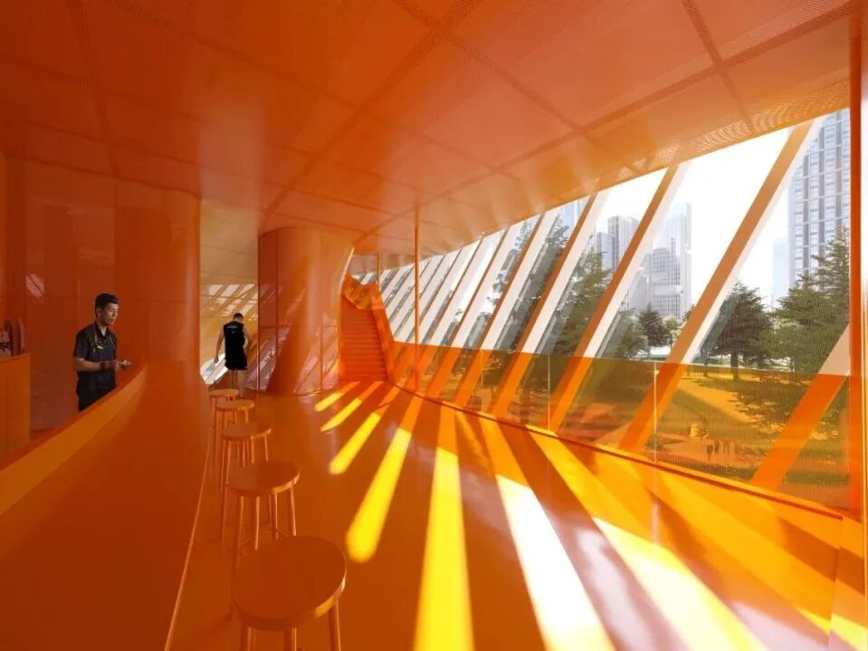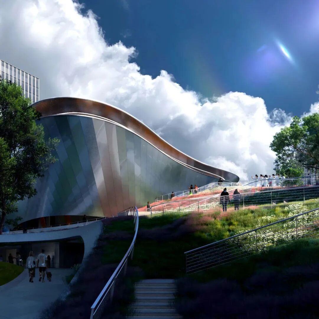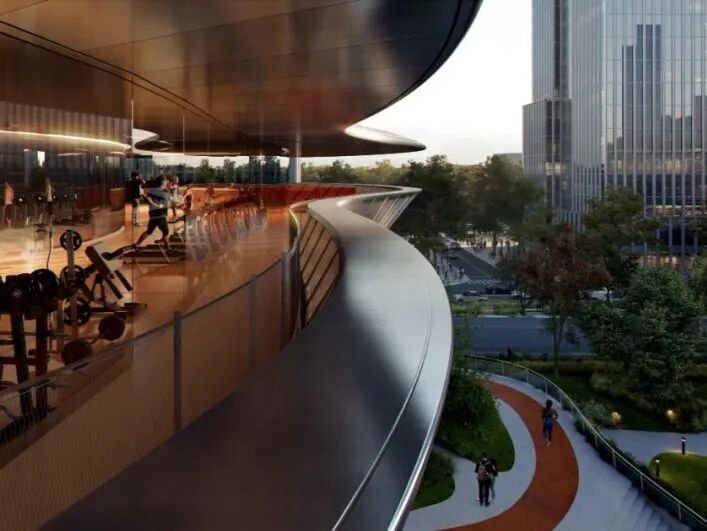 建筑外侧包裹着半透明膜材,变成可反射周边环境的轻盈“云朵”;室外球场、缓坡绿地等对市民开放的公共空间被巧妙地布局在建筑四周,与公园立体串联。为解决片区地下通风问题的数座冷却塔,造成了近5,200立方米的地面遮挡空间。MAD的设计巧妙地将冷却塔抬升至二层,环绕冷却塔设计了空中活动层。一层屋顶从四个方向延伸至公园界面并局部覆以绿植,与城市自然相接,形成立体的绿洲。