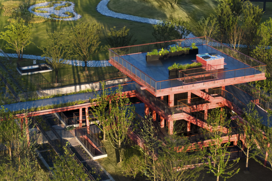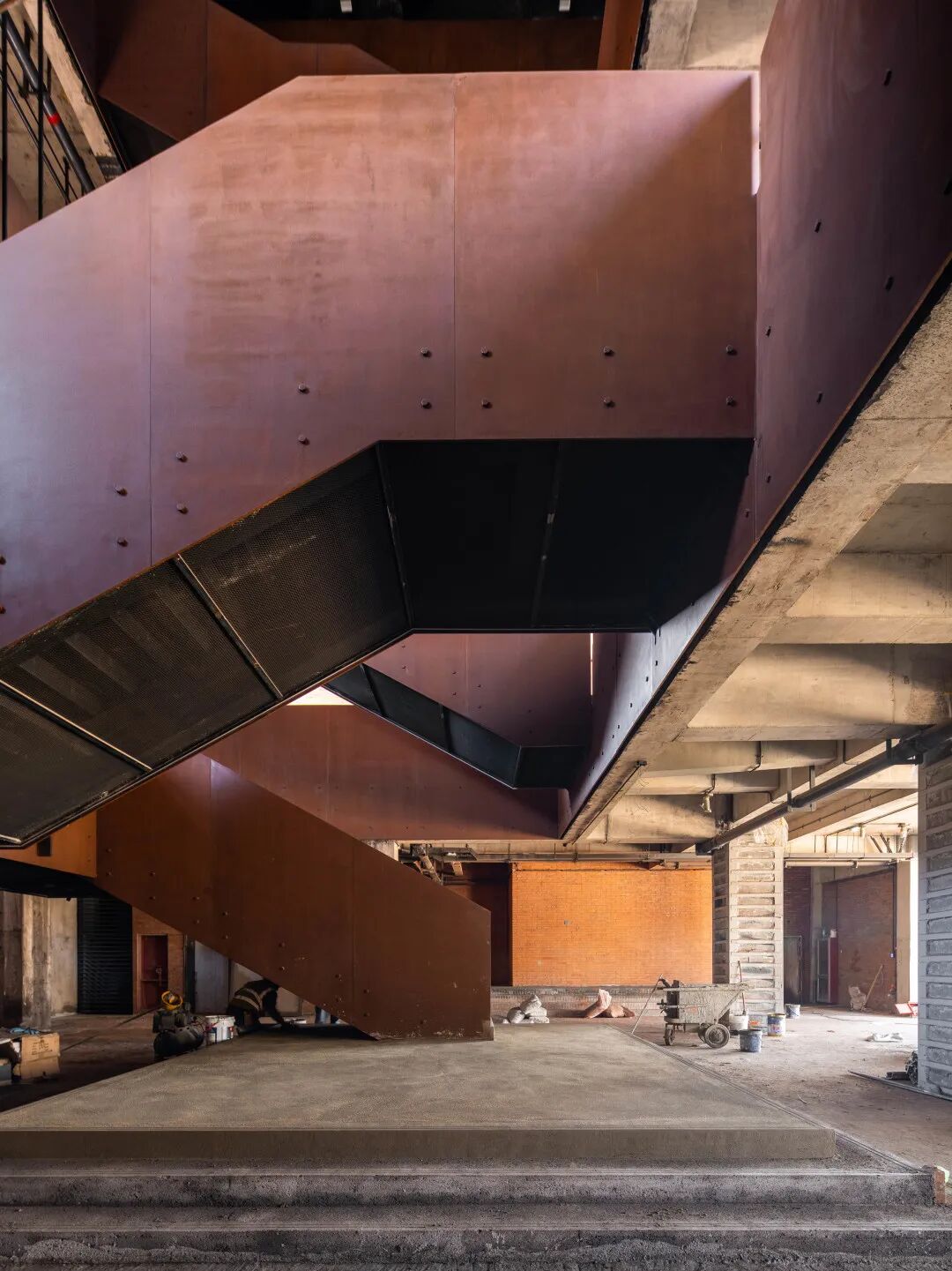 杭钢片区规划用地面积约44.3万平方米,场地内工业遗存类型丰富,但同时也存在遗存建筑分布零散、场地空旷缺乏游览趣味、遗存建筑空间不满足功能需求等问题。新体系以板柱为基本元素,以平远为形式特征,以锈红混凝土为基本材质,力求以适度的分寸融入遗存建筑。其形态对高耸而复杂的工业遗存是一种对比和衬托,而色彩和气质上则是一种呼应。