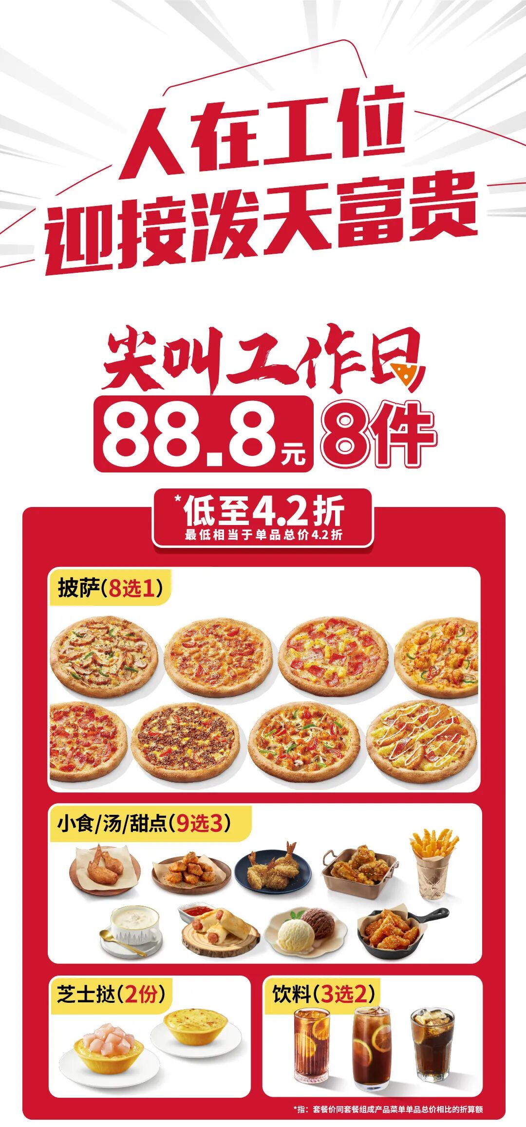 本活动优惠权益不与其他任何优惠共享。图示内容仅供参考,产品及包装请以实物为准。本活动不适用于机场、火车站、高速公路、旅游度假、游乐场、展览馆、奥特莱斯、精选餐厅、Les Elites以及部分必胜客特定餐厅 ,请详洽餐厅。必胜客宅急送不同送餐区域的菜单和价格有所不同,不同时段产品品项及价格有所不同,详情以输入送餐地址后显示的实际供应的菜单为准。如遇活动套餐/产品售罄,将为您替换为相近套餐/产品。必胜客宅急送各门店均有送餐范围限制,若您的送餐地址不在送餐范围内,我们将无法为您提供外送服务,敬请谅解。如有疑问,请咨询必胜客在线客服。