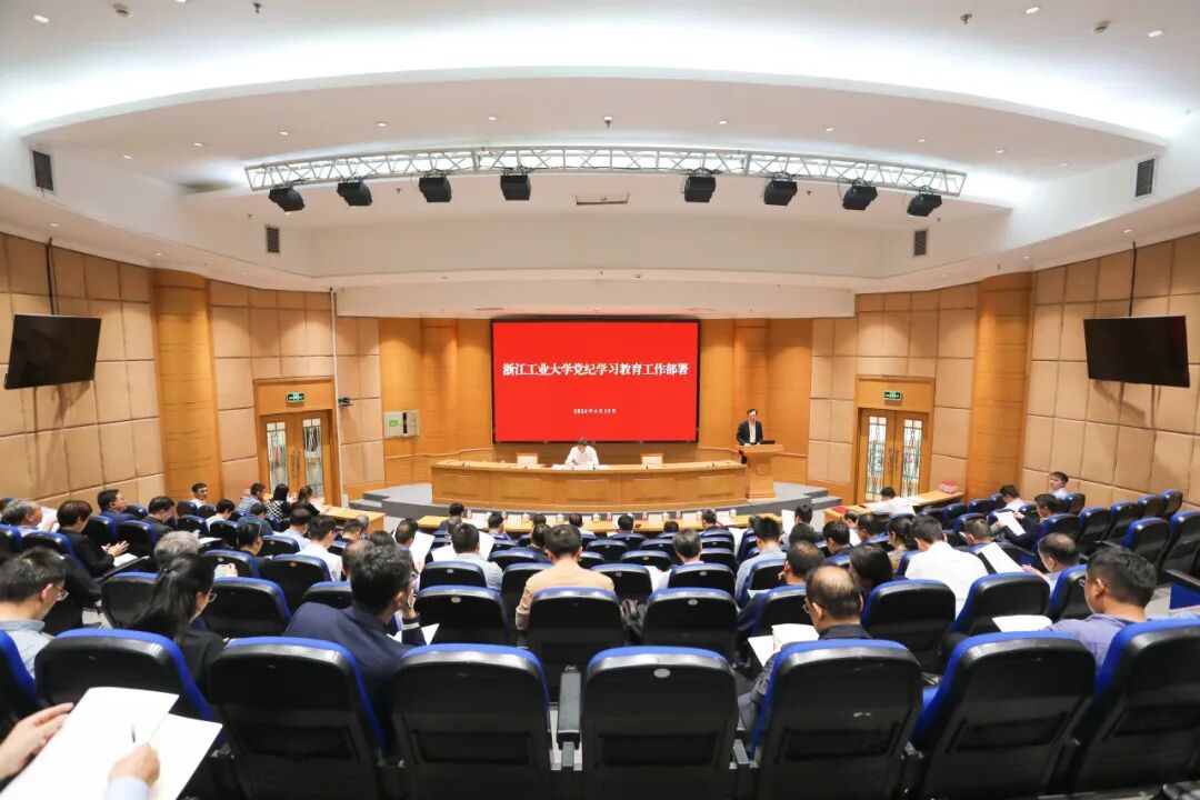 4月15日,浙江工业大学在朝晖校区传达学习贯彻习近平总书记关于党纪学习教育的重要讲话和重要指示精神,部署学校党纪学习教育工作。校党委书记蔡袁强主持会议并讲话,校党委委员、纪委委员、党群职能部门负责人、各二级党组织书记、机关党支部书记等参加会议。