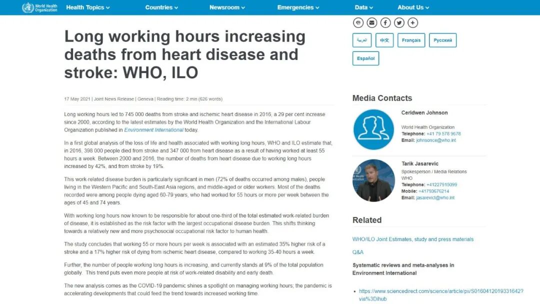 此前,世界卫生组织和国际劳工组织曾联合发布全球首份关于长时间工作对生命和健康影响的分析报告③,报告指出:而数据显示2016年一年内,因工作时间过长而造成的中风和心脏病发作共导致约74.5万人死亡,这一数字比2000年增长近30%。