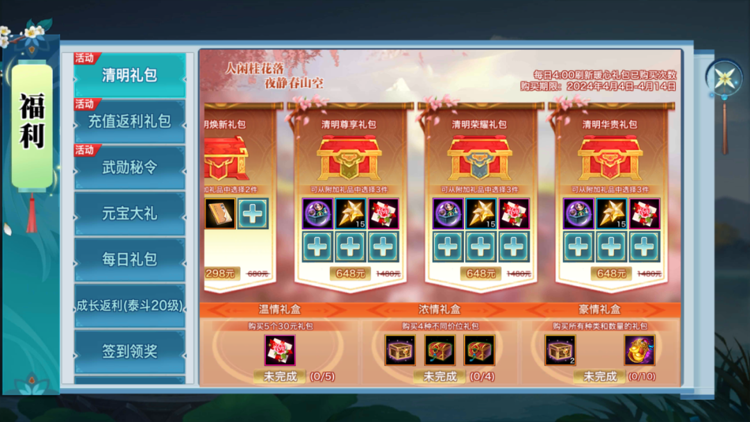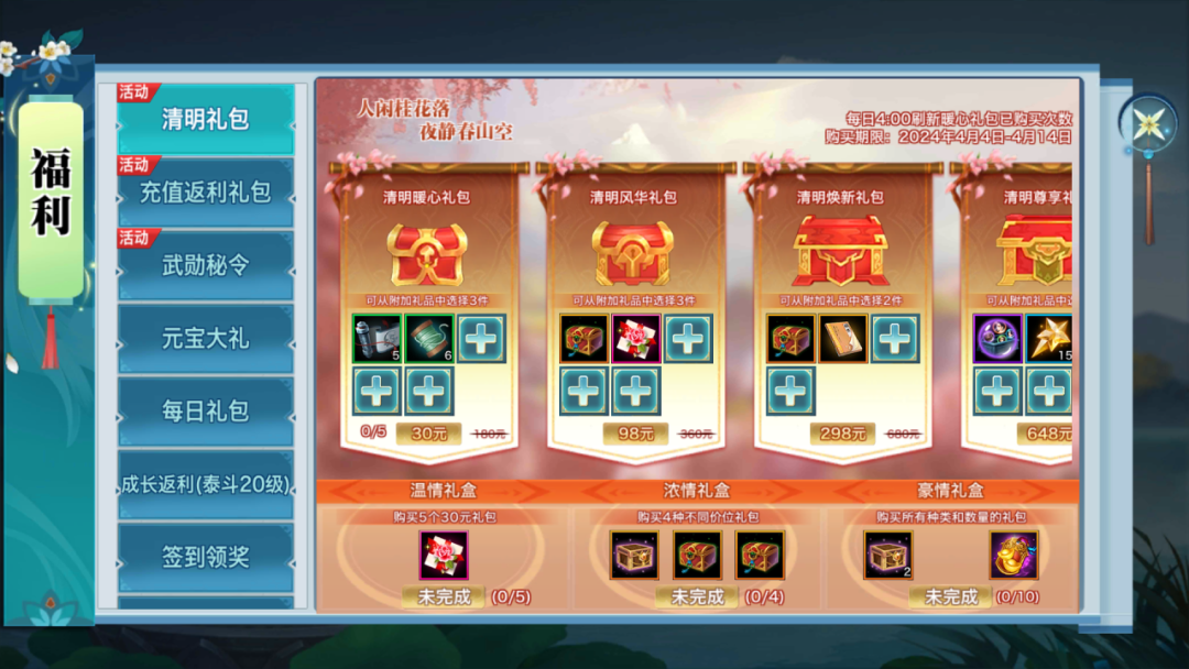 梨花风起正清明,游子寻春半出城。清明礼包在4月4日-4月14日期间限时开启,少侠们可在福利界面购买清明系列礼包!奖励多样、可自选,供少侠们随心选择!