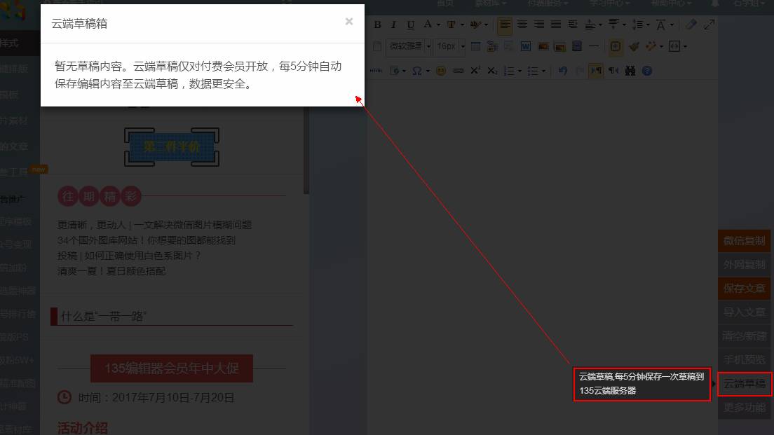使用编辑器最怕突然断电,突然电脑死机,浏览器崩溃。135编辑器的云端草稿功能可以每五分钟自动将目前的文章保存到云端上,就算忘了手动保存,文章也不会丢失。