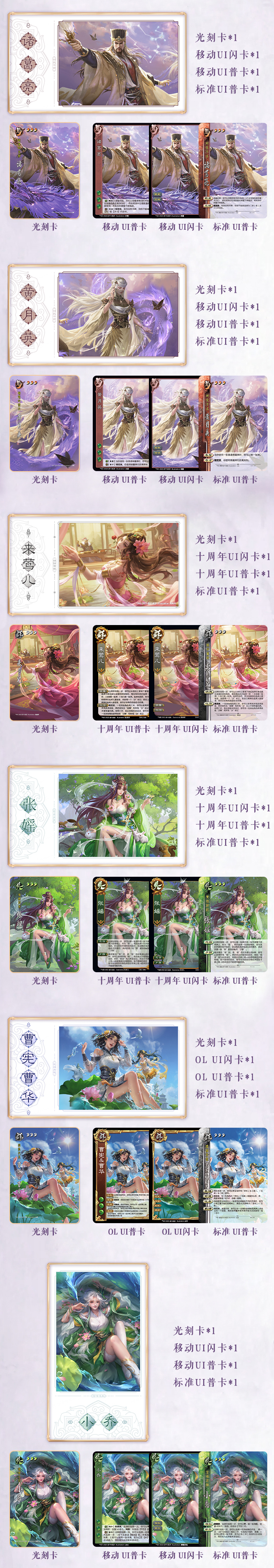 每位武将卡包中均包括一张光刻卡、一张移动UI闪卡、一张标准UI普卡以及一张标准UI普卡。无论玩家喜欢哪种UI设计,都可直接选择来进行线下游戏,做到了收藏游玩两不误。