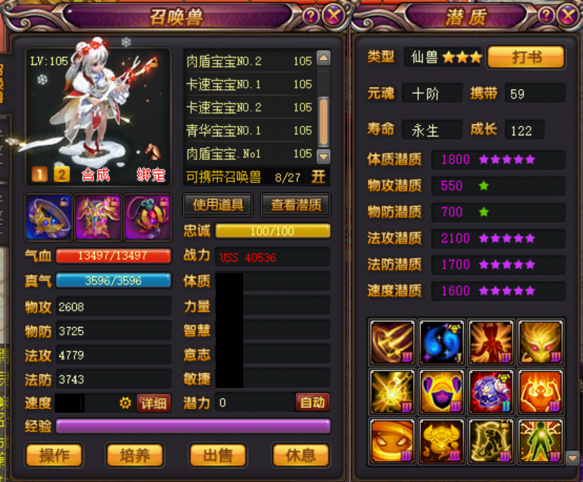 【蓝河】:通宝宝的话,我觉得合出多技能之后,启嗷萌萌和小判官,打怒生存都很不错,仙兽的话我觉得现在的仙兽强度比较大,要根据队伍的阵容搭配去选择合理的仙兽,我认为最强的仙兽是血公子,他可以帮我打兽王之路,100级的pk宝宝推荐可以问一下我的秘书云尊。