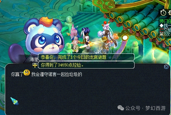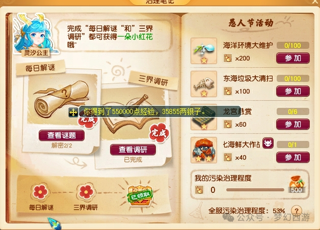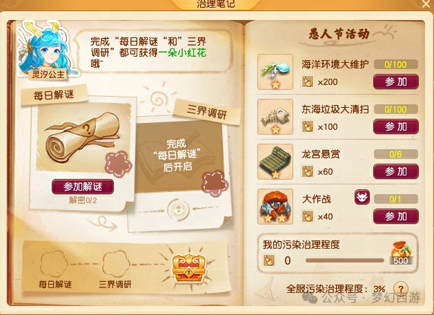 参与方式:点灵汐公主获得道具治污笔记,然后使用后选择【参加解谜】