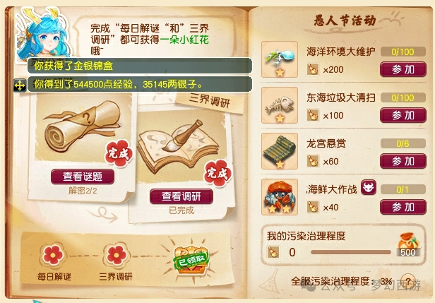 参与方式:长安城(220 120)找到NPC灵汐公主,点击获得道具治污笔记,然后使用后选择【参加解谜】