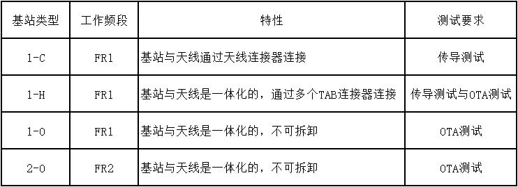 5G基站的射频性能测试分为传导测试(Conducted)和空口辐射(Radiated或者OTA,Over The Air)测试两类。从射频测试的物理连接的角度,5G基站可以分为1-C、1-H、1-O、2-O四种类型。