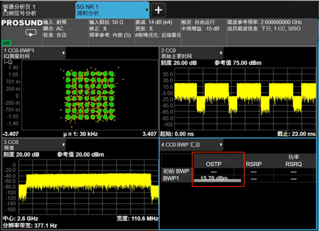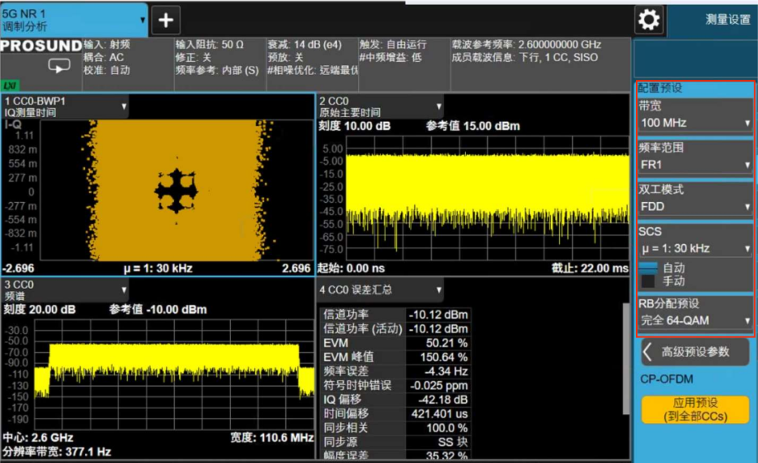 ③在信号分析仪上,使用信道功率(channel power)测量模式读取基站发射功率的数值和邻道抑制比的数值,使用SEM模式完成频谱发射模板的测试,使用调制分析模式完成EVM和频率误差测试,等等。