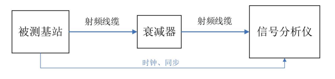 ①按照搭建测试链路,将基站天线连接器通过射频线缆经合适的衰减器连接至信号分析仪;