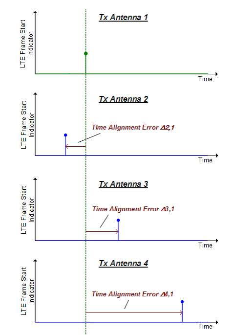 5G和5G测试中还有一种较为特殊的测试项目——发射通道时间一致性误差(Time alignment error(TAE))测试。以5G为例,由于5G广泛采用发射分集或空分复用技术,因此会用到两个或更多发射天线。多根天线上发射的信号在时间上有一定的时间延时,定义为时间一致性误差,如下图所示的Δ2,1,Δ3,1,Δ4,1表示天线2、3、4上的信号和天线1之间的时间差。