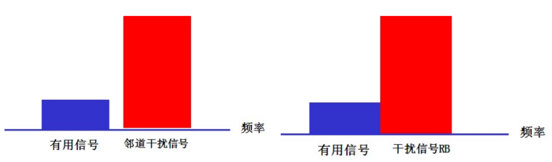 选择性是指有用信号在干扰信号出现情况下,接收机满足规定误码率时输入的最小信号电平。在5G基站测试中,又分为邻道选择性与共信道选择性。二者不同点在于干扰信号出现的位置。如下图左所示,进行邻道选择性测试时,干扰信号出现在有用信号带宽外的邻道。下图右所示的共信道选择性测试,干扰信号以ResourceBlock(RB)的形式出现在有用信号带宽内,并与有用信号在频率上紧密连接。