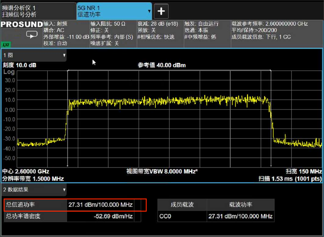 基站发射机会设计一个最大发射功率以进行区域覆盖。5G基站最大发射功率实测最大发射功率应在TS38.141-6.2.1章节所规定的指标范围之内,极端情况下不超过指标±3.2-3.5dB。下图是最大发射功率的频谱与信道功率读数。