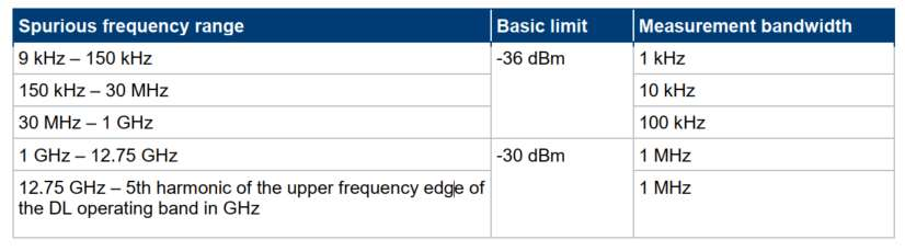 杂散发射包括发射机杂散和接收机杂散。基站产品测试杂散根据不同通信制式而不同,因为每个协议产品的通信带宽不一致,关注带内的杂散也不一致。各种协议也明确了各自的杂散要求,如5G 3GPP TS38.141对杂散的规定,即在9kHz-1GHz的频带内发射机为-36dBm;在1-12.75GHz的频带内发射机为-30dBm。
