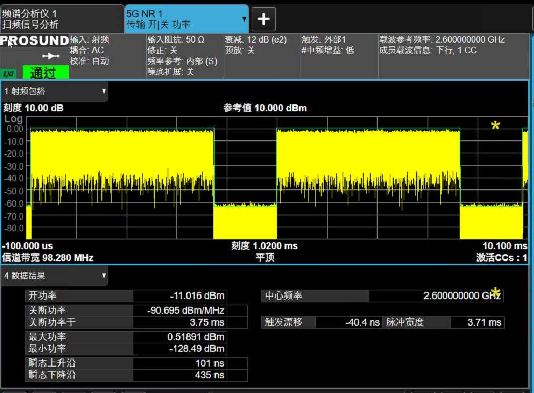 测量结果如下图,不仅可以显示发射机关断时的功率与门限值,还可以显示过渡时间。