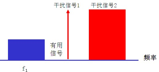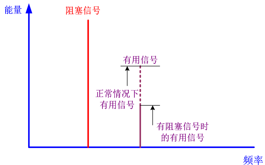 接收机的阻塞测试是指在有用信号频率的一定范围内存在一个CW或者调制的干扰信号,从而使接收机误码率恶化到规定限值时的最小输入信号功率。阻塞用于描述接收机承受接收频点之外大信号干扰的能力。当存在阻塞信号时,接收机对有用信号的增益减小,这是因为当存在通常相对大得多的阻塞信号时,接收机大部分功率用于放大阻塞信号,对有用信号的放大减少。如下图所示: