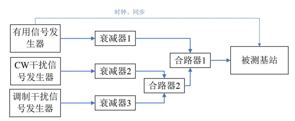 测试平台和3.2章节一致,通过合路器向基站输入有用信号和阻塞信号,为了避免阻塞信号源在有用信号频率上的杂散信号的影响,可以适当选择陷波器,陷波器中心频点选取为有用信号频率。