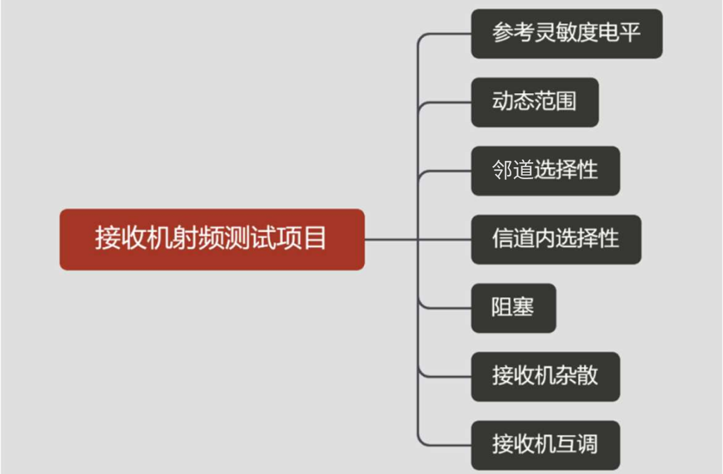 接收机测试项主要测试基站接收机对上行信号解调的能力以及滤波器对干扰的抑制能力。接收机测试主要包括的测试项如下图所示。