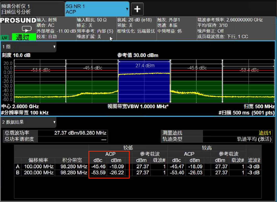 图2.4.1 5G 100MHz信号的ACLR测试结果