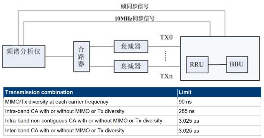 测试平台搭建如下图所示,仅需一台频谱仪接收两路合路的天线发射信号即可,频谱仪上的5G解调软件会测量两个天线上的TM1.1参考信号DM-RS符号的时间差来计算发射通道时间一致性误差。测试规范TS38.141规定时间一致性误差应小于90ns。