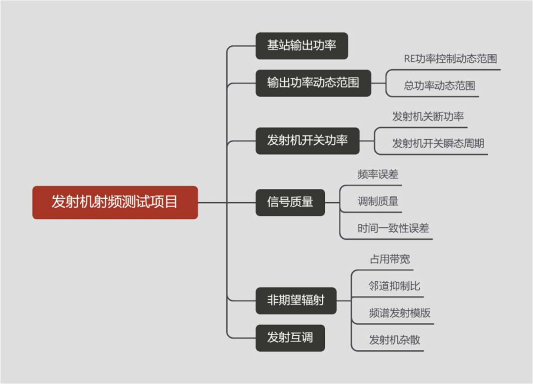 ⑤非期望辐射包含占用带宽、邻道抑制比、频谱发射模板、发射机杂散四个项目,主要保证基站发射信号时不对工作频带内或带外其他频段产生影响。