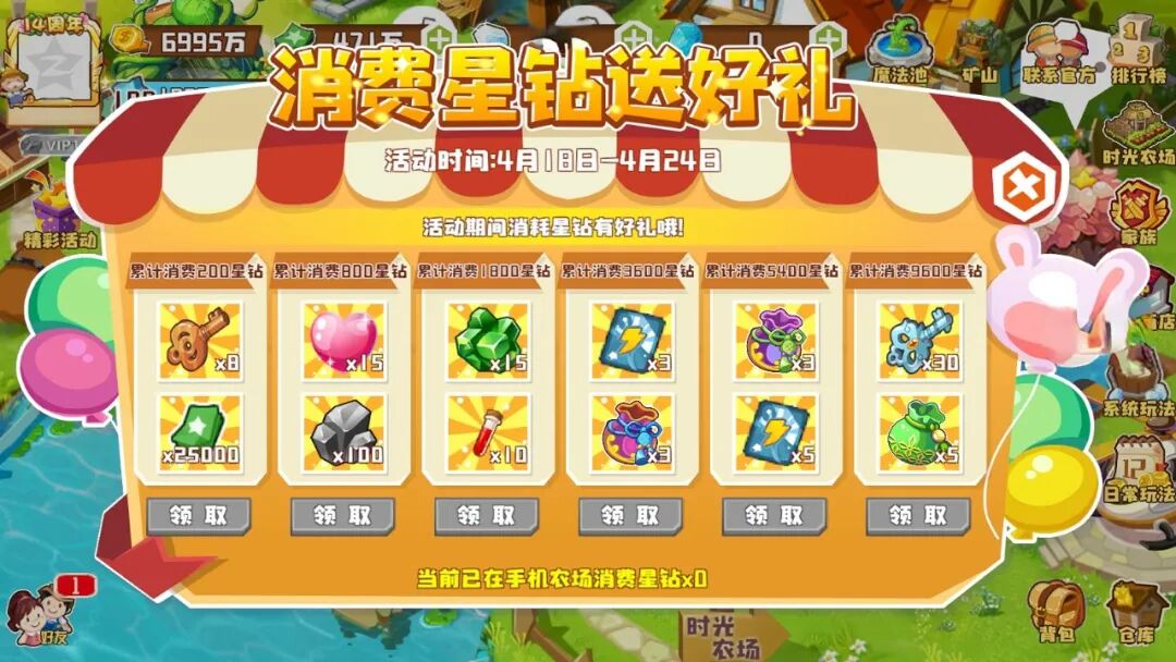 活动期间消费星钻达到指定额度可领取对应道具奖励,每档奖励只能领取一次。